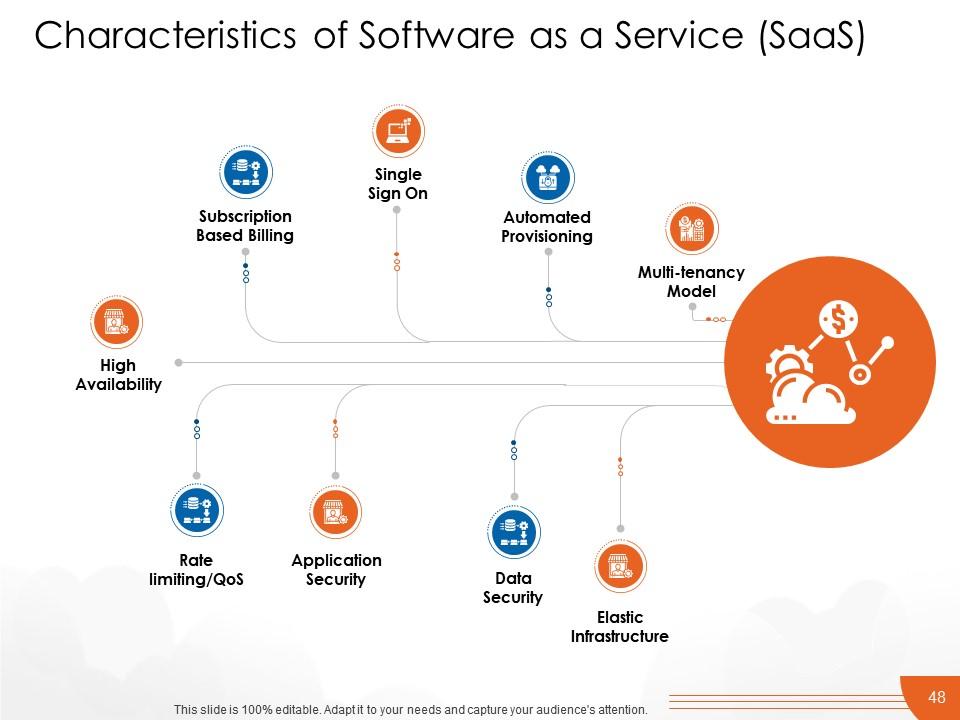 This slide comes up with the essential features of software as a service (SaaS), which includes single sign-on for easy accessibility, multi-tenant models for efficient resource sharing across users, and automated provisioning for hassle-free deployment.
