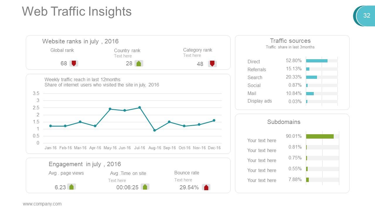 Understand how real-time visitors engage with your site: Which countries users visit your site from, the most visited pages, and info like which days and times your site gets the most web traffic. This helps in measuring your website's growth and identifying places where you can improve the experience for your buyers. This PPT slide depicts the website's rank in July (2016), weekly traffic reach in the last 12 months, traffic sources, subdomains, and engagement in July (2016). Get it now!