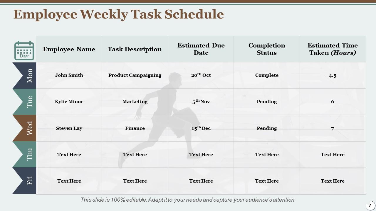 Having a weekly task schedule can really help employees manage their work effectively. By seeing all their tasks laid out for the week, they can focus on what needs to be done first based on deadlines, importance, and urgency. This helps ensure that critical work gets completed on time. The schedule includes details like employee name, task description, due date, completion status, and time taken. Having this schedule keeps employees focused, productive, and organized throughout the week, and this PPT Layout will help you implement this technique.