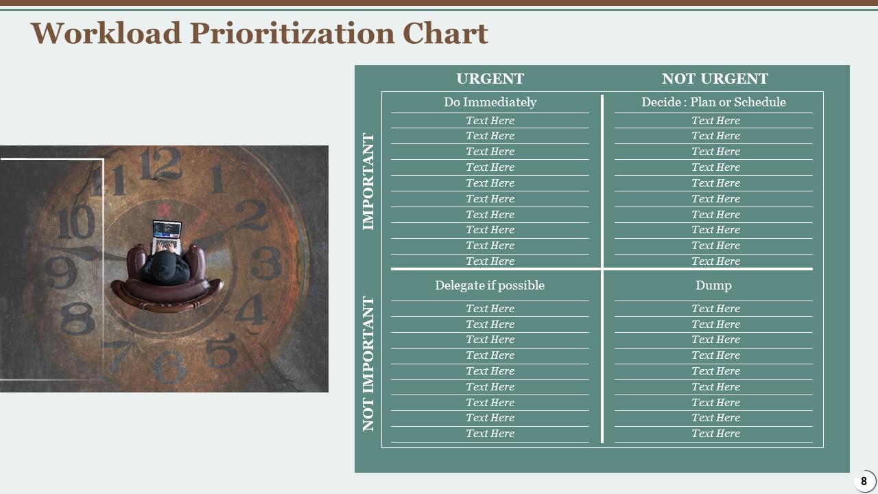 This PowerPoint Slide is essential for time management as it helps employees to focus their efforts on tasks that are both urgent and important and avoid overburdening them while doing less important tasks. Using this presentation layout, you can categorize tasks into urgent, important, not urgent and not important, individuals can efficiently and effectively allocate their time. A workload prioritization chart highlighted in this PPT Layout promotes decision making regarding whether tasks should be delegated or eliminated altogether.