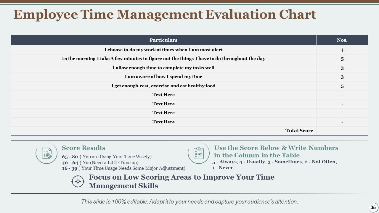 The Employee Time Management Evaluation Chart offers a systematic approach to evaluating how workers manage their time, pinpointing areas that require development and strengths. This chart showcases particulars and score results. It helps managers and HR managers to evaluate the employees' strengths and areas of improvement. This makes it easier to carry out focused developmental and training initiatives that increase output and effectiveness.