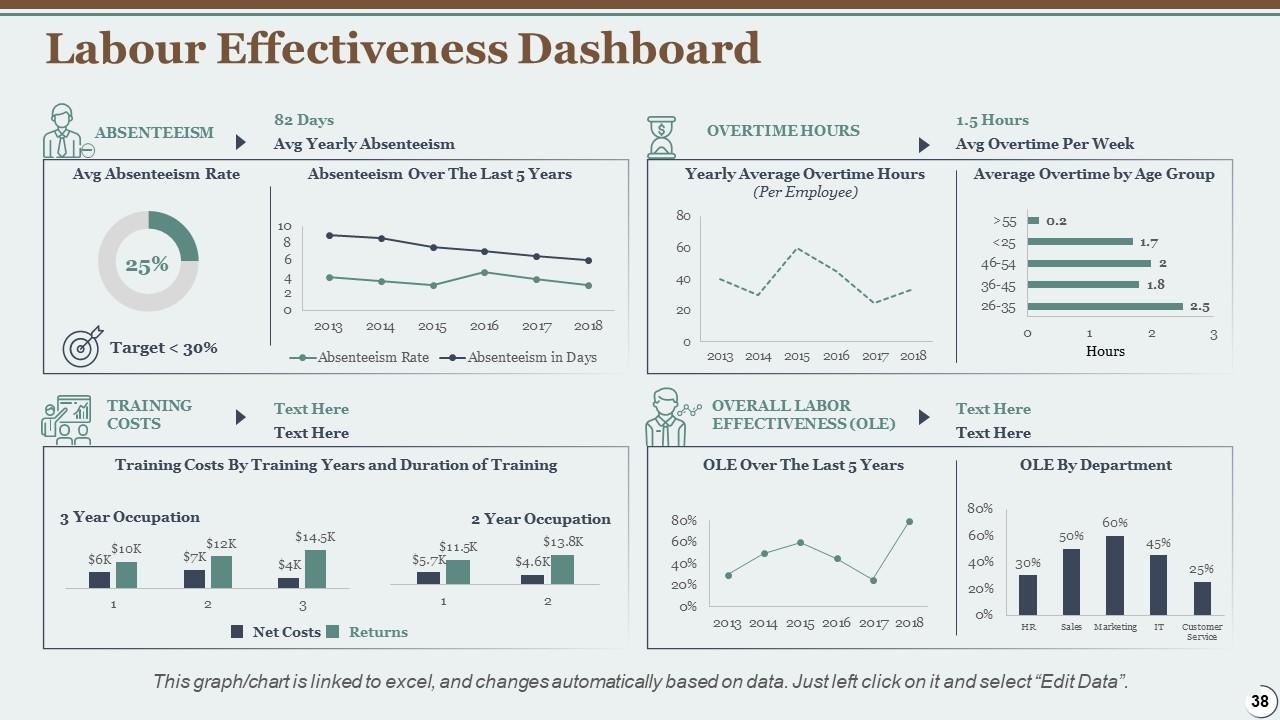 The value of a labor effectiveness dashboard is found in its capacity to offer a thorough summary of workforce performance indicators that are essential for maximizing output and effectiveness. Pie charts and graphs are used in this dashboard to provide graphical representations of variables like training expenses, overtime hours worked, and absenteeism. This provides insights into work utilization and resource allocation. Managers can employ it to spot trends, patterns, and areas that need development, which helps them make well-informed decisions that will increase worker productivity. It gives businesses the ability to maximize production, save expenses, and simplify operations.