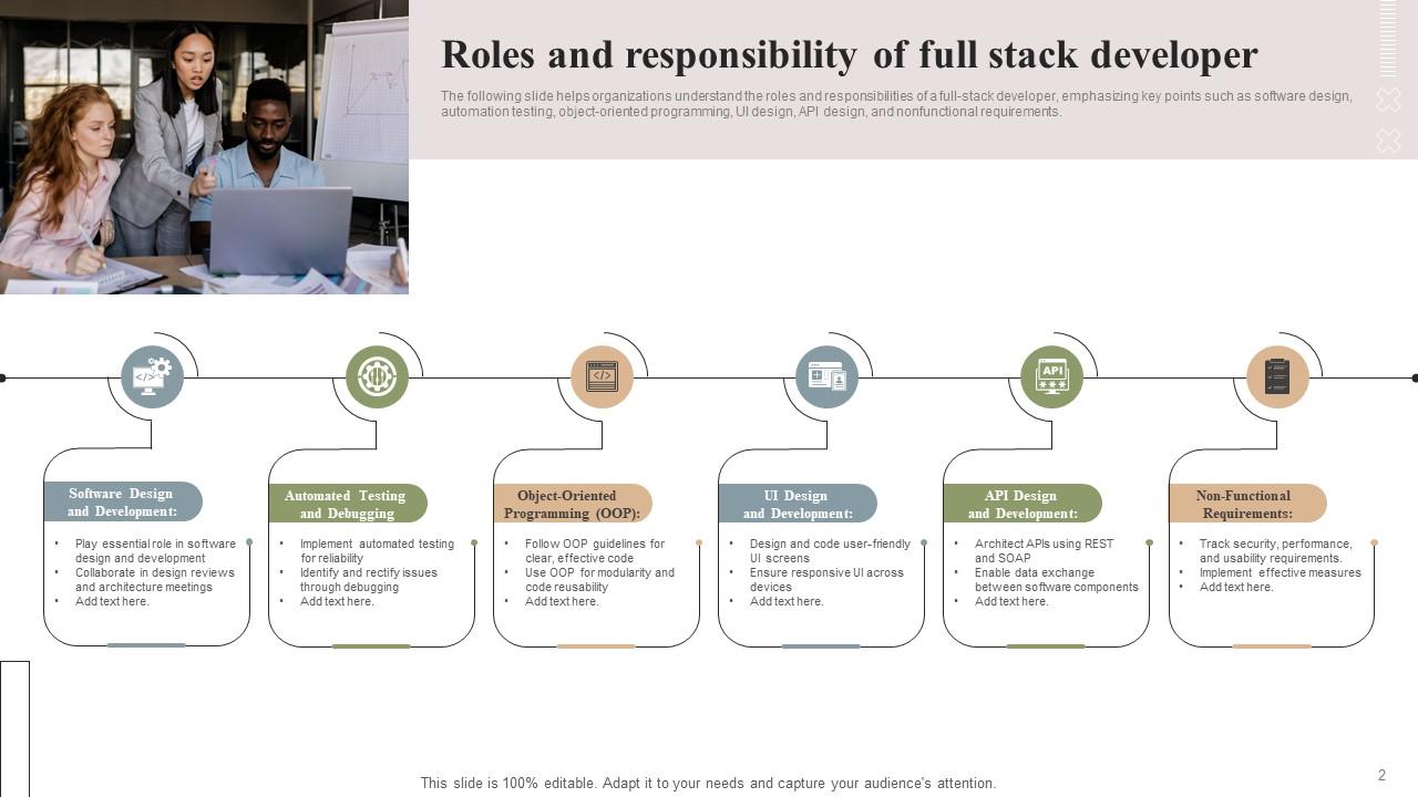The following slide helps organizations understand the roles and responsibilities of a full stack developer, emphasizing key points such as software design, automation testing, object oriented programming, UI design, API design, and nonfunctional requirements. Presenting our set of slides with Roles And Responsibility Of Full Stack Developer. This exhibits information on six stages of the process. This is an easy to edit and innovatively designed PowerPoint template. So download immediately and highlight information on Development, Automated, Programming.
