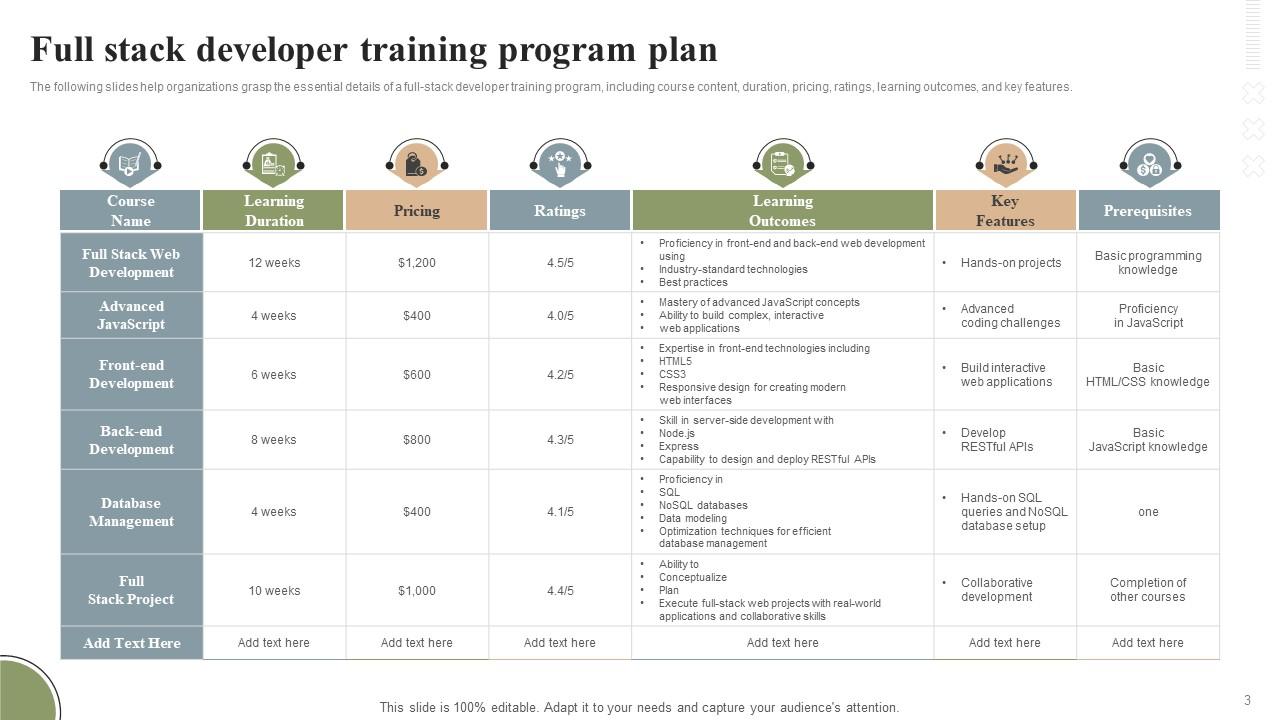 The following slides help organizations grasp the essential details of a full stack developer training program, including course content, duration, pricing, ratings, learning outcomes, and key features. Presenting our well structured Full Stack Developer Training Program Plan. The topics discussed in this slide are Developer, Training, Program. This is an instantly available PowerPoint presentation that can be edited conveniently. Download it right away and captivate your audience.