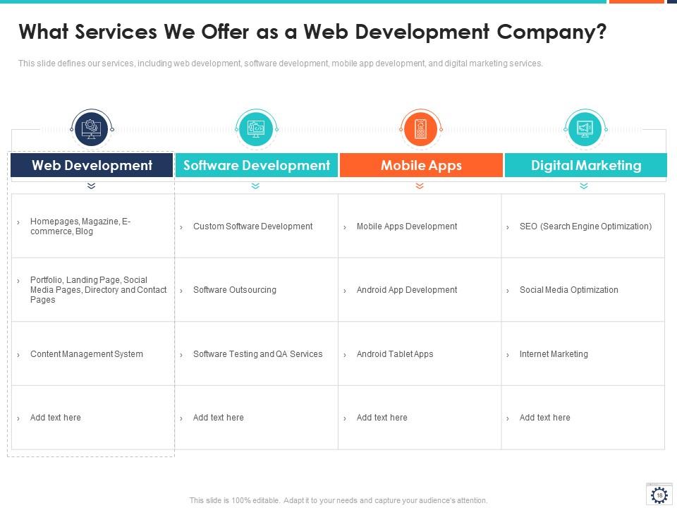 Demonstrating your services as a web development company will show your clients the different services you provide. This template will help you highlight your services through the help of a table. You can highlight your services like web development, software development, mobile apps, and digital marketing. You can add your specializations underneath your services mentioned below the different services your company provides: what kind of web development you do, landing page designing, social media pages, software outsourcing, software testing and QA services, search engine optimization, mobile apps development, internet marketing, search engine optimization, and social media optimization and many more according to your company. Â