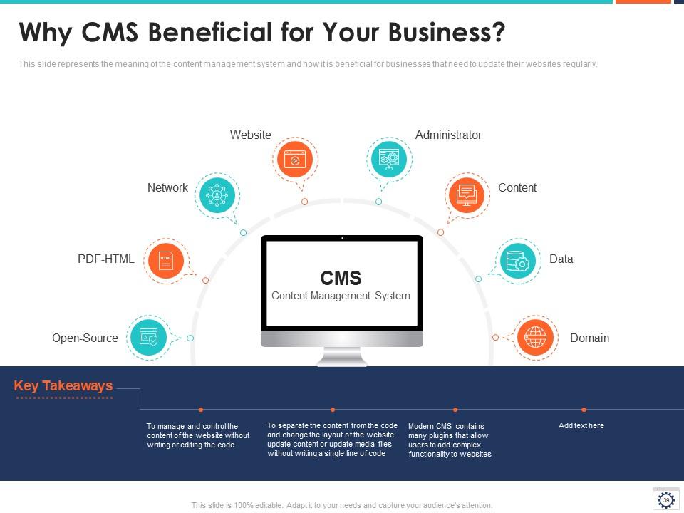 Highlighting the Content Management System is another way to captivate the client's attention and explain how to supervise and control the website's content without writing or editing the code. You can easily explain the content management system to clients through attractive icon designs and highlighting various plugins.